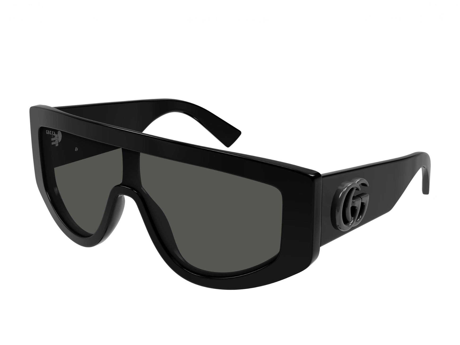 Montature in acetato di spessore con logo Double G tridimensionale sulle aste. Audace maschera in acetato monolente. Logo Double G con finitura galvanica argento.